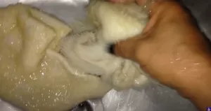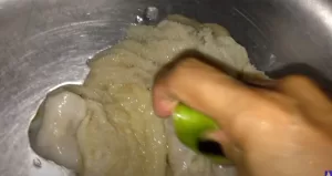 Primero, un buen enjuague con sal: Enjuaga el mondongo con agua fría. Luego échale sal gruesa y frótalo bien para sacarle la grasa y la mugre que traiga. Déjalo reposar unos 10 o 15 minutos y enjuaga otra vez.
