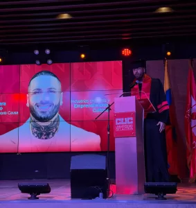 Durante la ceremonia, lució una toga azul y un birrete negro. Con una sonrisa emocionada, agradeció a su familia, a Dios y a todos los que nunca dejaron de creer en él. “Este reconocimiento me recuerda que nunca es tarde para cambiar, para aprender y para hacer las cosas bien”, expresó ante un público que lo aplaudió de pie.